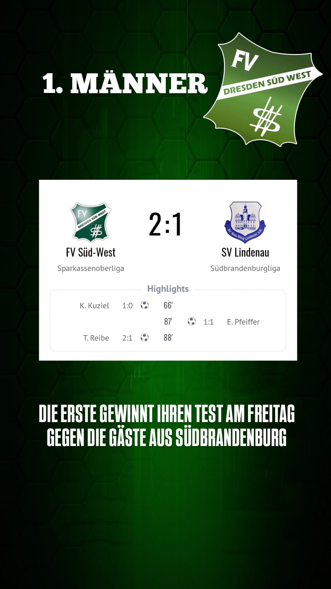 Die Erste konnte am Freitagabend unter Flutlicht gegen den aktuell Zweiten der Kreisoberliga Südbrandenburg erfolgreich testen, wenn auch erst in Hälfte 2 die Tore fielen und man sich für teilweise zielstrebigen Fußball aus Hälfte 1 belohnte.